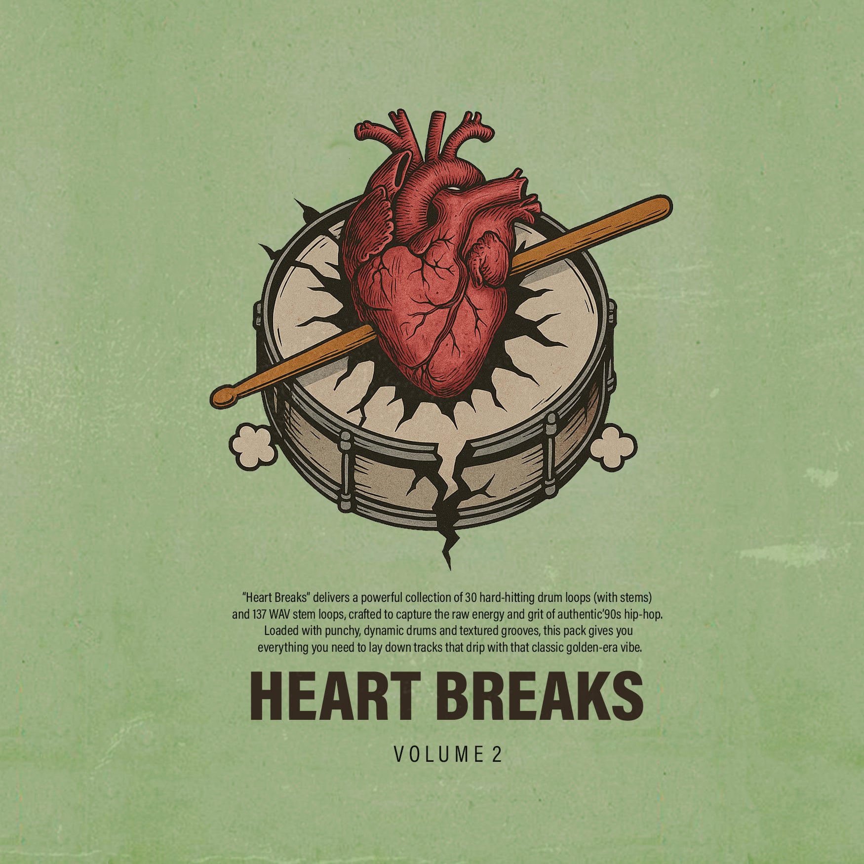 “Heart Breaks Vol 2” delivers a powerful collection of 28 hard-hitting drum loops (with stems) and 132 WAV stem loops, crafted to capture the raw energy and grit of authentic ’90s hip-hop.